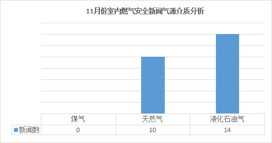 明确气源介质的事故新闻中,液化石油气共14起,占比58%;天然气10起,占比42%。11月份引发室内燃气安全新闻的主要气源介质为液化石油气。